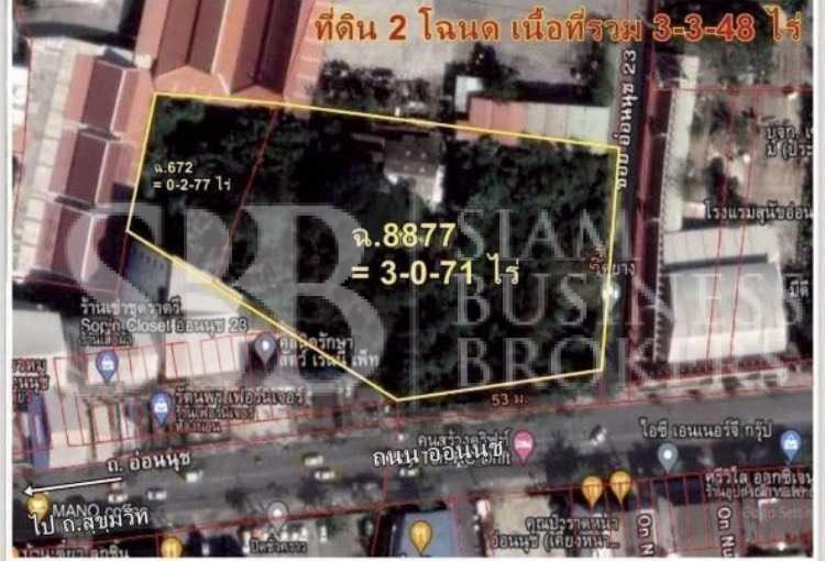 Unlock a prime development opportunity with this 3-rai (4,800 sq.m.) land plot in On Nut, perfectly positioned near Sukhumvit Road. Located in a high-demand Yellow Zone, this site is ideally suited for a low-rise boutique hotel, luxury condominium, or private international school. Offering a strategic balance of residential tranquility and city accessibility, the plot is surrounded by established lifestyle amenities and provides easy transit to the BTS Skytrain. Prime location, versatile zoning, and limitless potential.